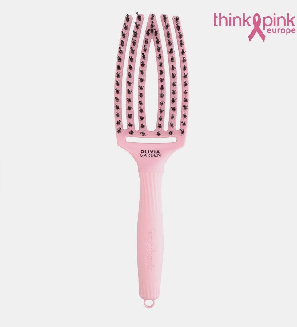 Olivia Garden Fingerbrush M hiusharja. Laadukas, uniikki pään muotoa mukaileva harja selvittää hiukset erinomaisesti aitoharjasten ja nylonmuovipiikkien ansiosta. Harja on joustava ja soveltuu niin kuivan kuin kostean hiuksen harjaamiseen, selvitykseen, muotoiluun, föönäämiseen ja päivittäiseen käyttöön. Kumisen varren ansiosta harja pysyy kädessä.