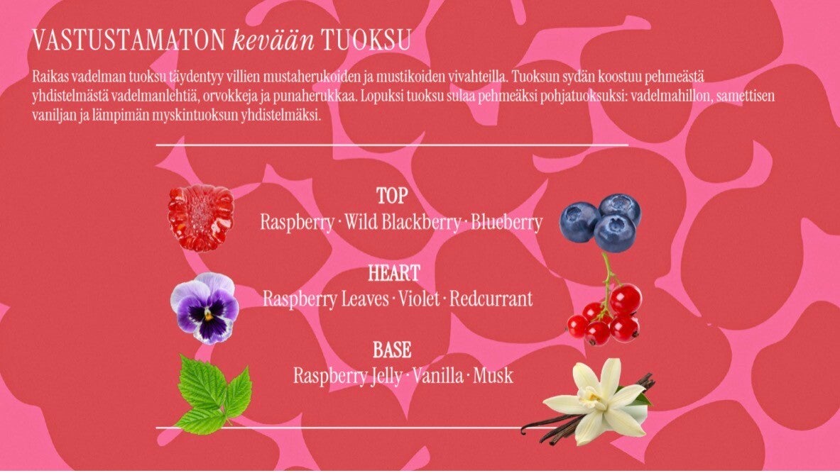 VADELMA KOSTEUTTAVA JA UV-SUOJAAVA HOITOSUIHKE tarjoaa selvitystehoa ilman latistavaa vaikutusta. Antioksidanttirikas vadelmaöljy ravitsee hiuksia ja suojaa ulkoisia stressitekijöitä vastaan. Pohjoinen ksylitoli ja tehoaine Pentavitin syväkosteuttavat hiuksia tehokkaasti. Sisältää UVA- ja UVB-suojan hiuksille.